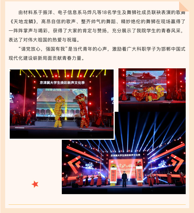 由共青团邯郸市委、中国联通邯郸分公司、邯郸市教育局和河北工程大学联合举办的“把青春献给祖国——庆祝中华人民共和国成立75周年展演暨2024年京津冀大学生焕彩新声文化季邯郸赛区颁奖典礼”国庆前夕在河北工程大学体育场举行。共青团邯郸市委书记徐帼一,邯郸市教育局局长薛顺利,河北工程大学、邯郸科技职业学院等六所高校相关负责同志出席并观看演出。