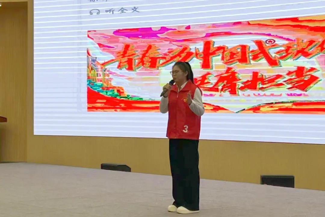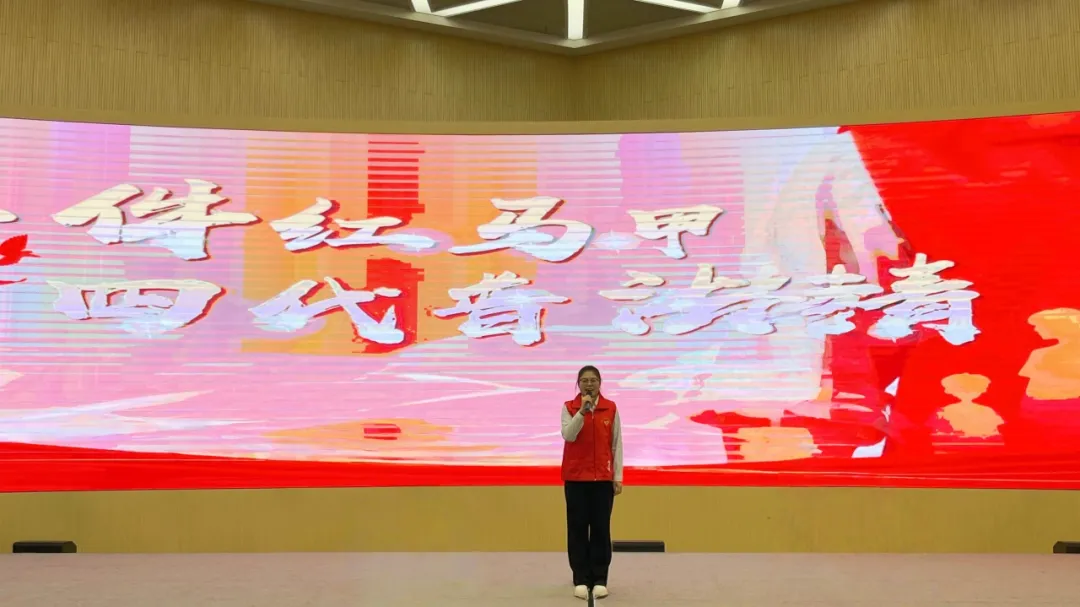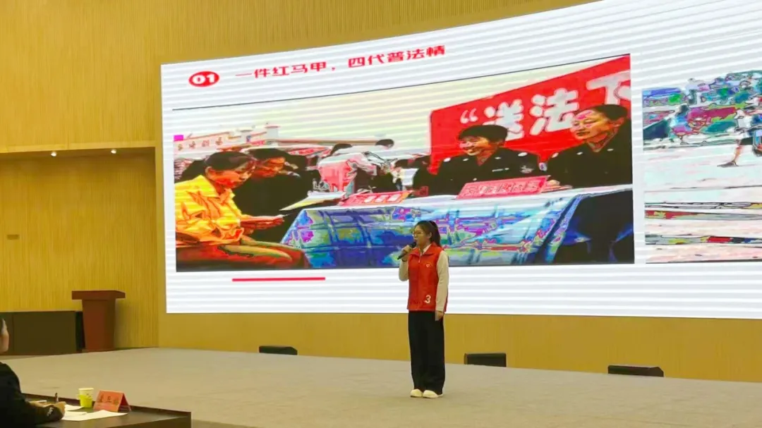2025 年 12 月 5 日下午,邯郸市青少年活动中心红领巾剧场内掌声雷动、氛围热烈。作为邯郸科技职业学院的参赛代表,冯献献同学身着志愿者红马甲登台,以《一件红马甲,四代普法情》为题,将个人成长与 40 年普法历程深度交融。