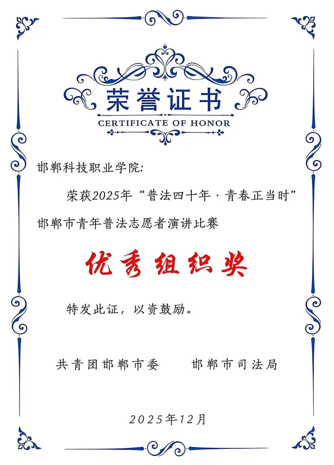 喜报频传,捷报盈门!12月5日,由共青团邯郸市委、邯郸市司法局联合主办的“普法四十年・青春正当时”——邯郸市青年普法志愿者演讲比赛决赛圆满落幕。经过激烈角逐,邯郸科技职业学院冯献献同学以真挚的情感、深刻的法治感悟与出色的现场表达,从众多优秀选手中脱颖而出,摘得一等奖(第一名)桂冠!