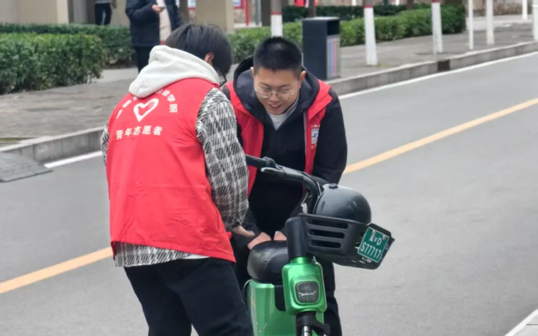 面对杂乱的共享单车,志愿者们化身"单车管家",两人一组默契配合,合力将乱停放的单车搬运至指定区域,仔细摆放整齐,让原本杂乱的共享单车变得井然有序,为师生出行提供了极大便利。