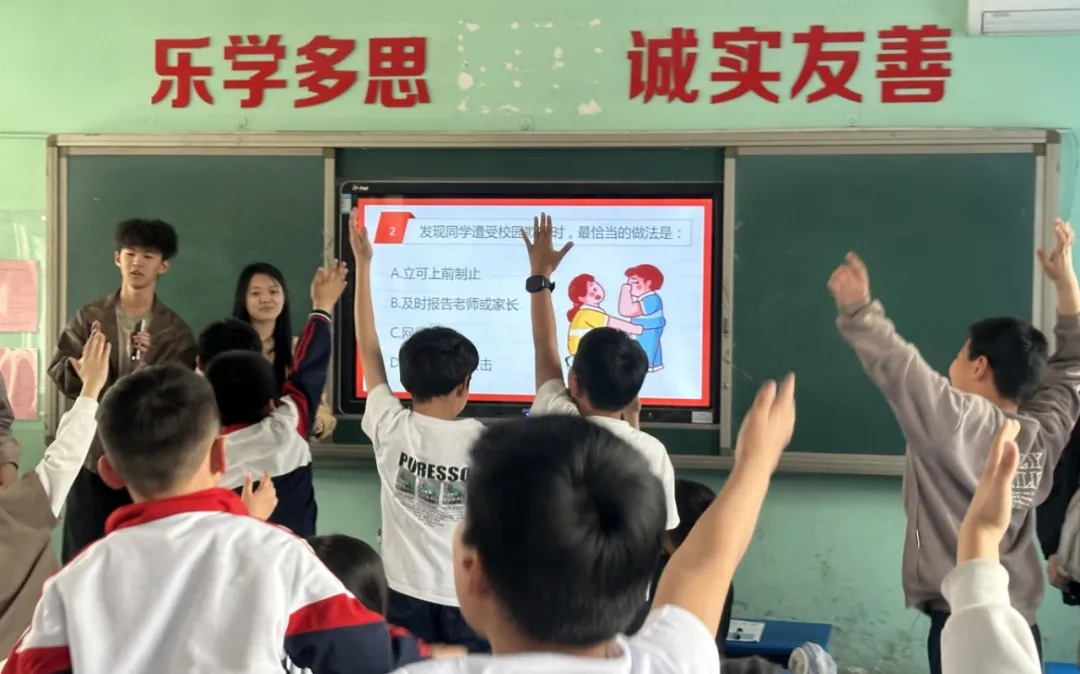在讲解过程中,还穿插了互动答题环节,考验同学们对这堂教育科普课内容的掌握程度。“发现同学遭受欺凌时,最恰当的做法?”志愿者提出问题,小学生们精神饱满纷纷举手抢答,现场气氛热烈非凡,展现出学生们良好的安全意识和表达能力。