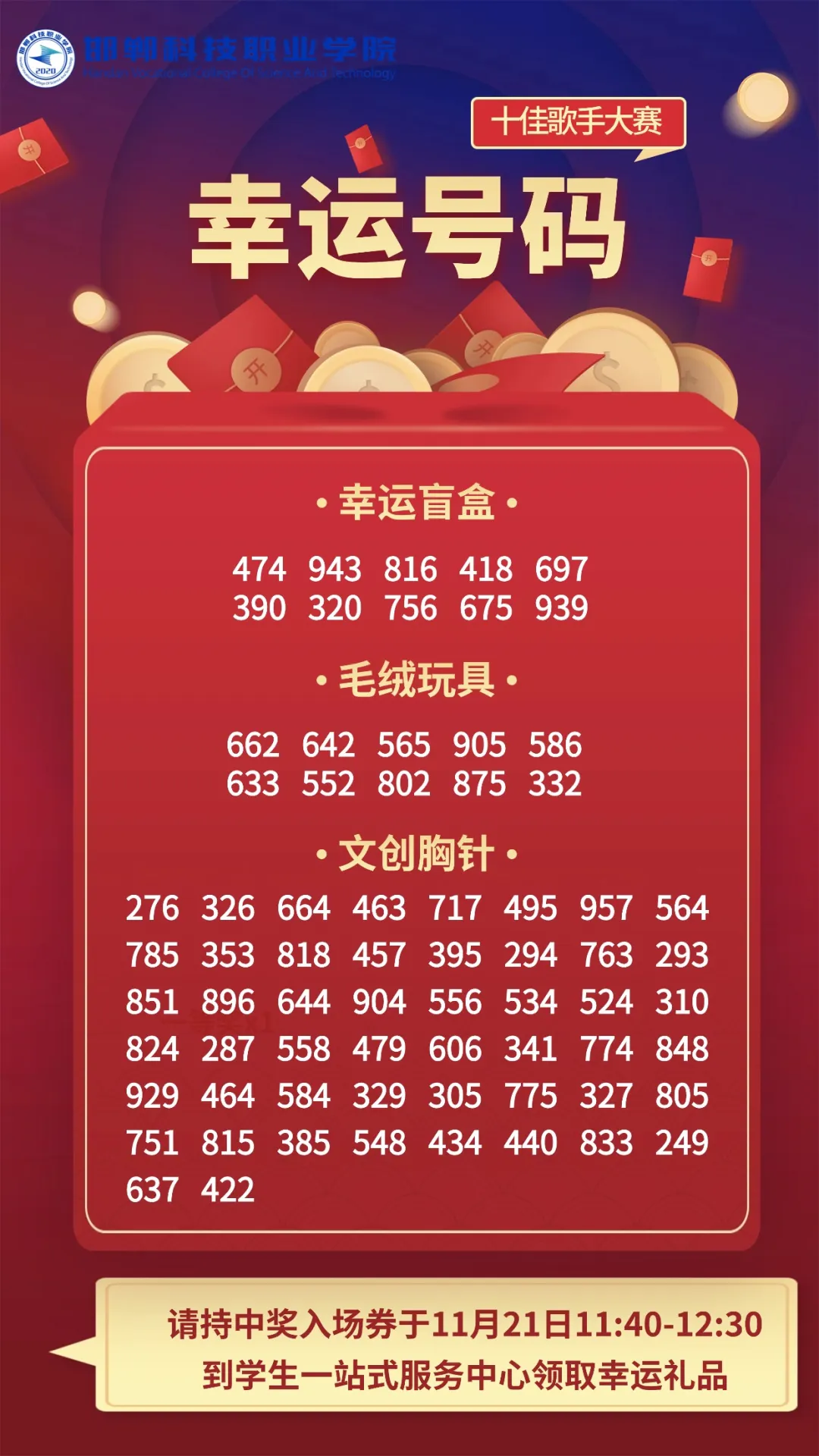 若你的入场券编号与下方公布的幸运编号一致,即可凭入场券主券到“学生一站式服务中心”,领取纪念礼品!