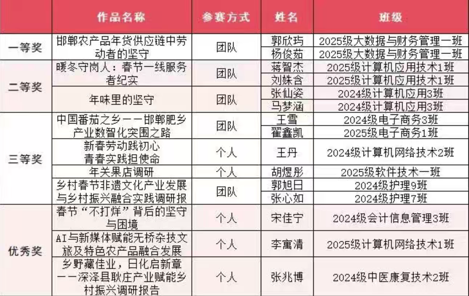 活动期间,我院学生踊跃参与、积极实践,以躬身力行诠释劳动精神,用匠心创作呈现实践成果,一份份高质量作品充分展现青年学子热爱劳动、勤于劳动、善于劳动的良好精神风貌。经综合评审、严格遴选,本次寒假劳动教育实践活动优秀作品正式揭晓!